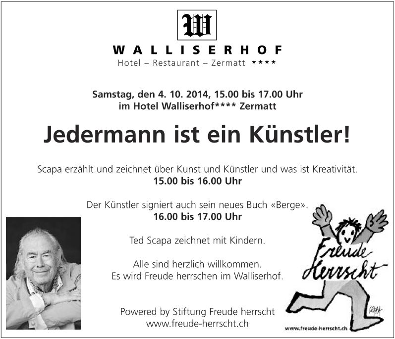 In Zusammenarbeit mit dem Walliserhof Zermatt, der Stiftung „Freude herrscht“ von Alt-Bundesrat Adolf Ogi und dem Künstler Ted Scapa findet am Samstag, 4. Oktober 2014 von 15 bis 17 Uhr ein spannender Workshop statt unter dem Motto „Jedermann ist ein Künstler!“.